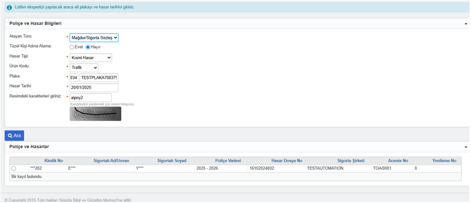 Bir önceki ekranda bulunan "Eksper Atama Durum Sorgulama" butonu kullanılarak atam türü ve plaka bilgisi ile hasar bilgileri detayı sorgulanabilir.