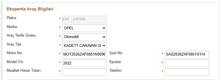 Bu adımda hasar talebinde bulunulan araca ait bilgiler hasar dosyası üzerinde varsa ekranda otomatik getirilir.