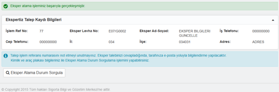 “Tamirhane Bilgileri” girildiği durumda İl ve İlçeye göre saat 09:00-11:00 -13:00 ve 16:00 saatlerinde eksper ataması yapılarak tarafınıza bilgilendirme yapılacaktır.