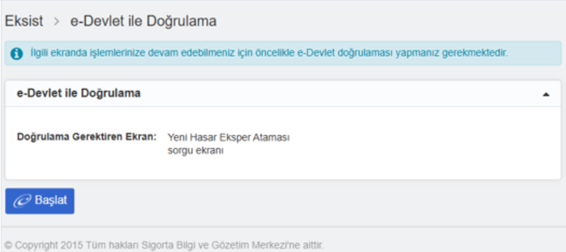 İlgili ekranda hasar talepleri için "Başlat" butonuna tıklanır.