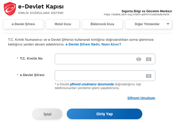 https://online.sbm.org.tr/htm-eksist/public/eksperTalep/sorgu.sbm linkinden aşağıdaki şekilde Trafik ve Kasko ürünü için e-Devlet doğrulaması yapılır.