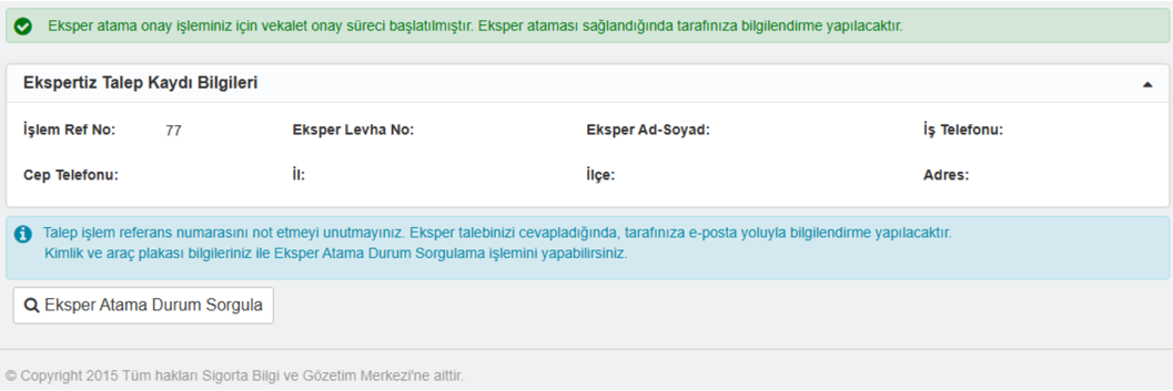 Bir önceki ekranda bulunan "Eksper Atama Durum Sorgulama" butonu kullanılarak vekaleten atama yapan kimlik ve plaka bilgisi ile hasar bilgileri ve atama durum detayı sorgulanır. SBM onay sürecine giden vekaletname ile yapılan atamalarda ekrandaki "Atama Durumu" alanında "Vekalet Onayı Bekleniyor" şeklinde görülür.